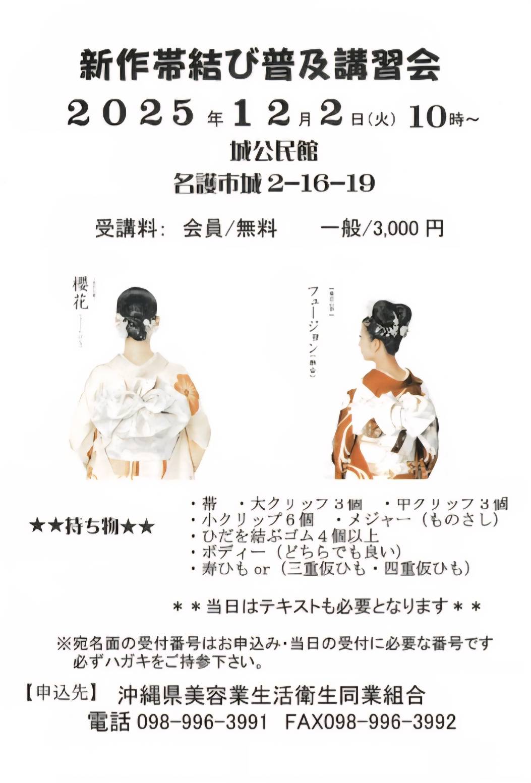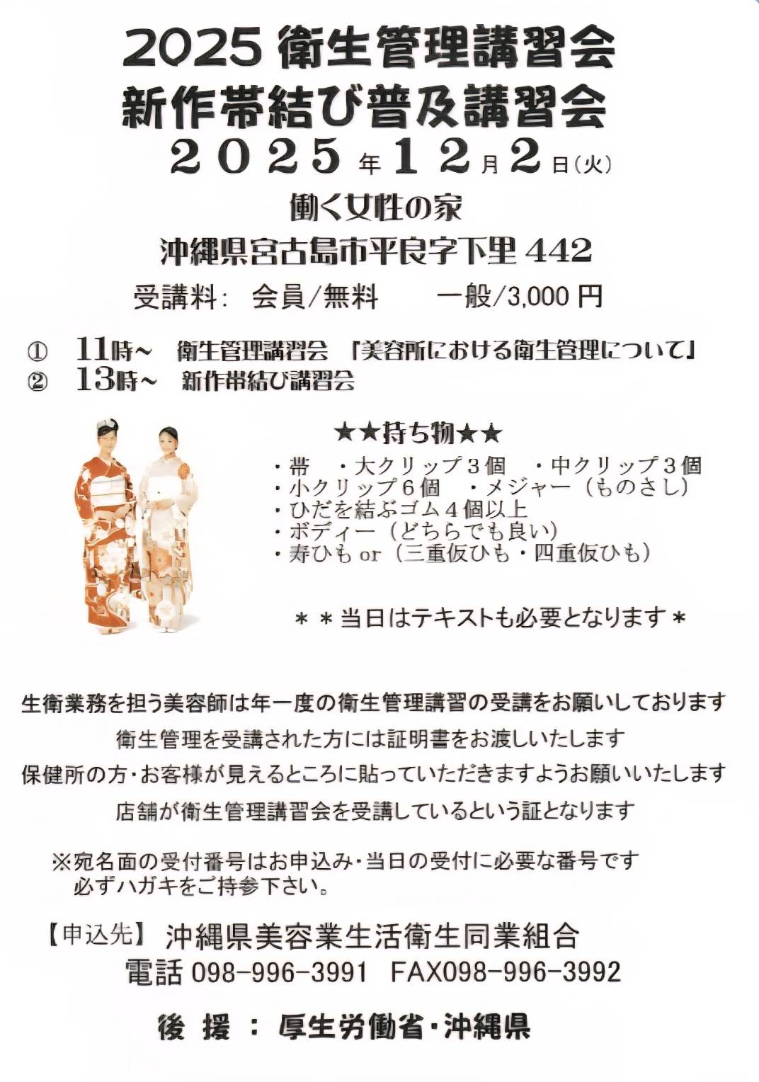 2025/12/2に「衛生管理講習会、新作帯結び講習」がございます