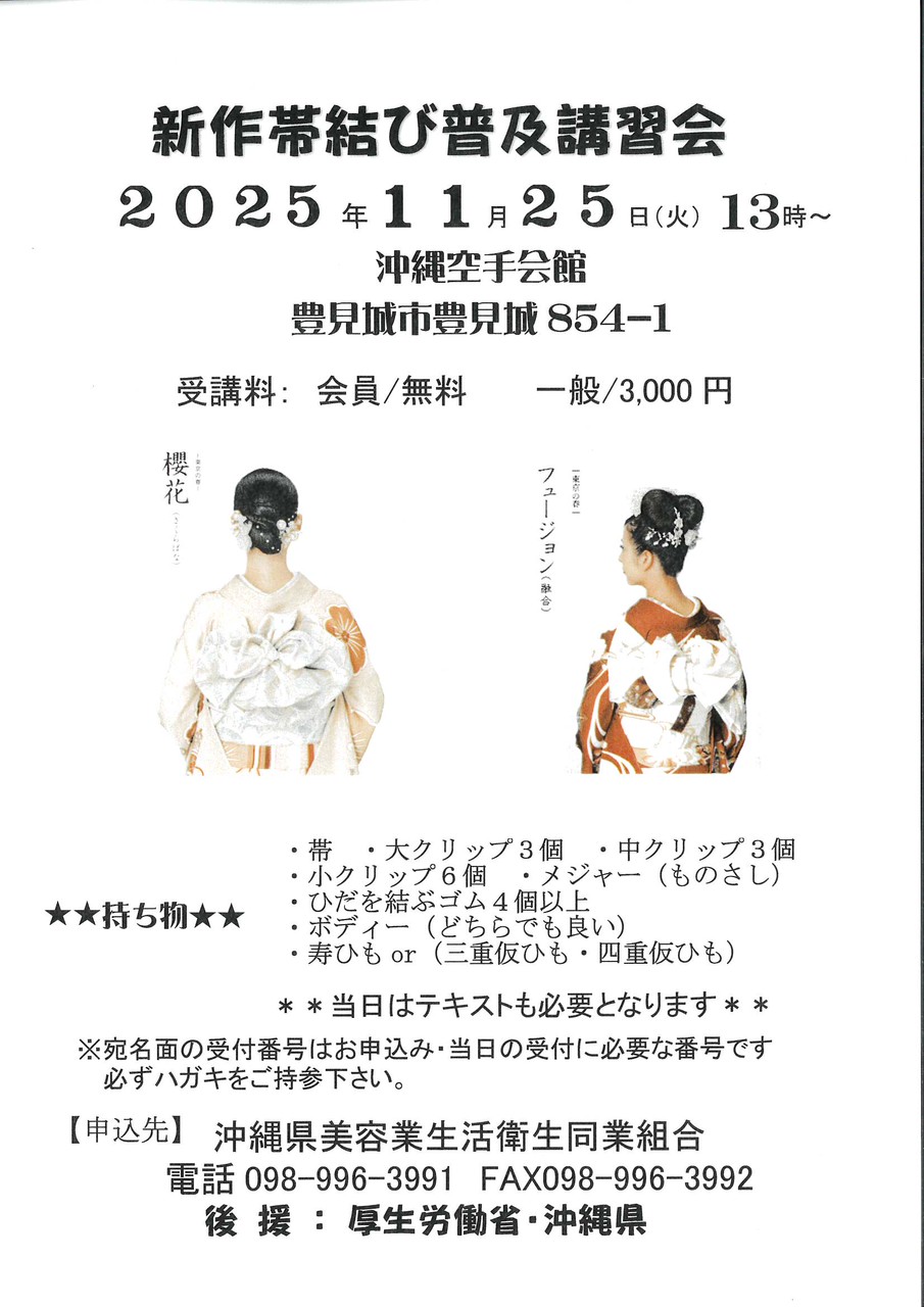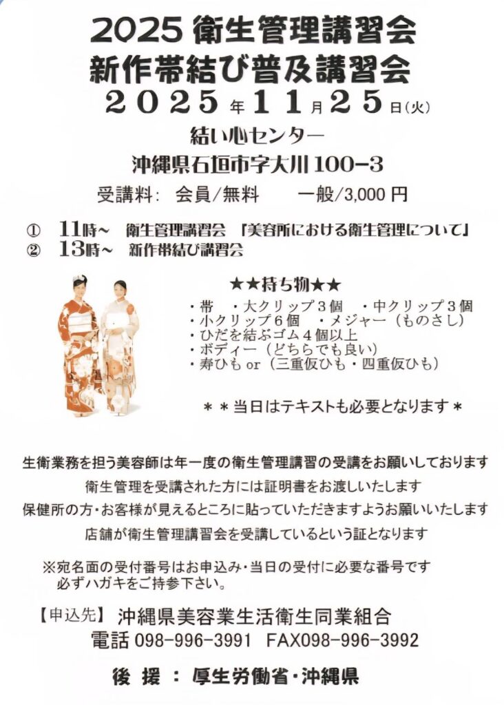 2025/11/25に「衛生管理講習会、新作帯結び講習会」がございます