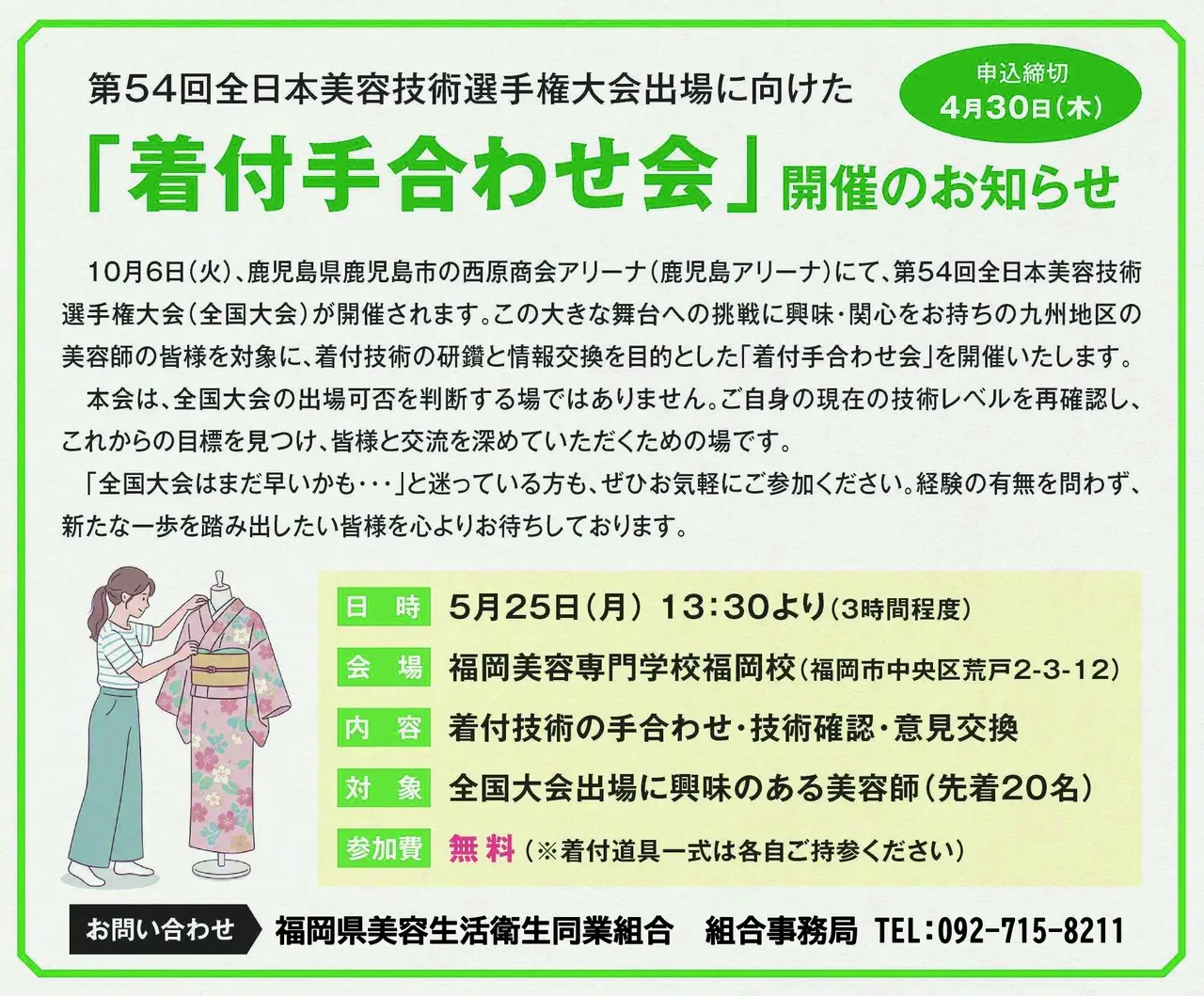 着付技術の研修と情報交換を目的とし、「全国大会はまだ早い・・・」と思っている方も、是非ご参加ください。